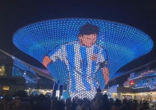 17日晚,梅西球迷在上海世博谷以及闵行爱琴海购物中心包下大屏幕,用灯光秀庆祝阿根廷美洲杯夺冠,并为梅西送上“绝代无双”“天生球王”的盛赞。